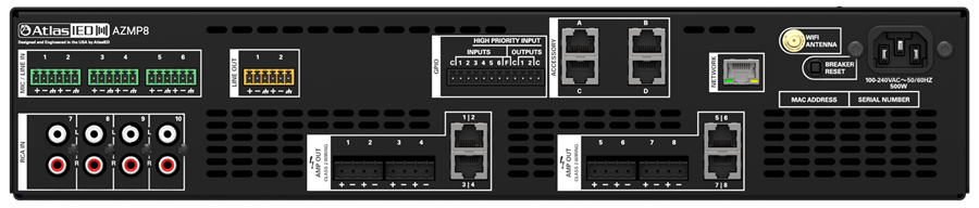 The AZMP8 utilizes amplifier power sharing technology that allows for efficient use of available power and avoiding system overdesign due to traditional amplifier power ratings. The AZMP8 can produce 1200W of total power, with each output channel being software assignable anywhere between 5-600W.
