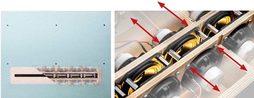 Durch die Anordnung und Verstrebung der Lautsprecher-chassis nach dem ML BOXER Prinzip entstehen am Laut-sprechergehäuse keine Vibrationen. Eine Entkopplung des Subwoofers von der umliegenden Trockenbaukon-struktion ist deshalb nicht erforderlich.
