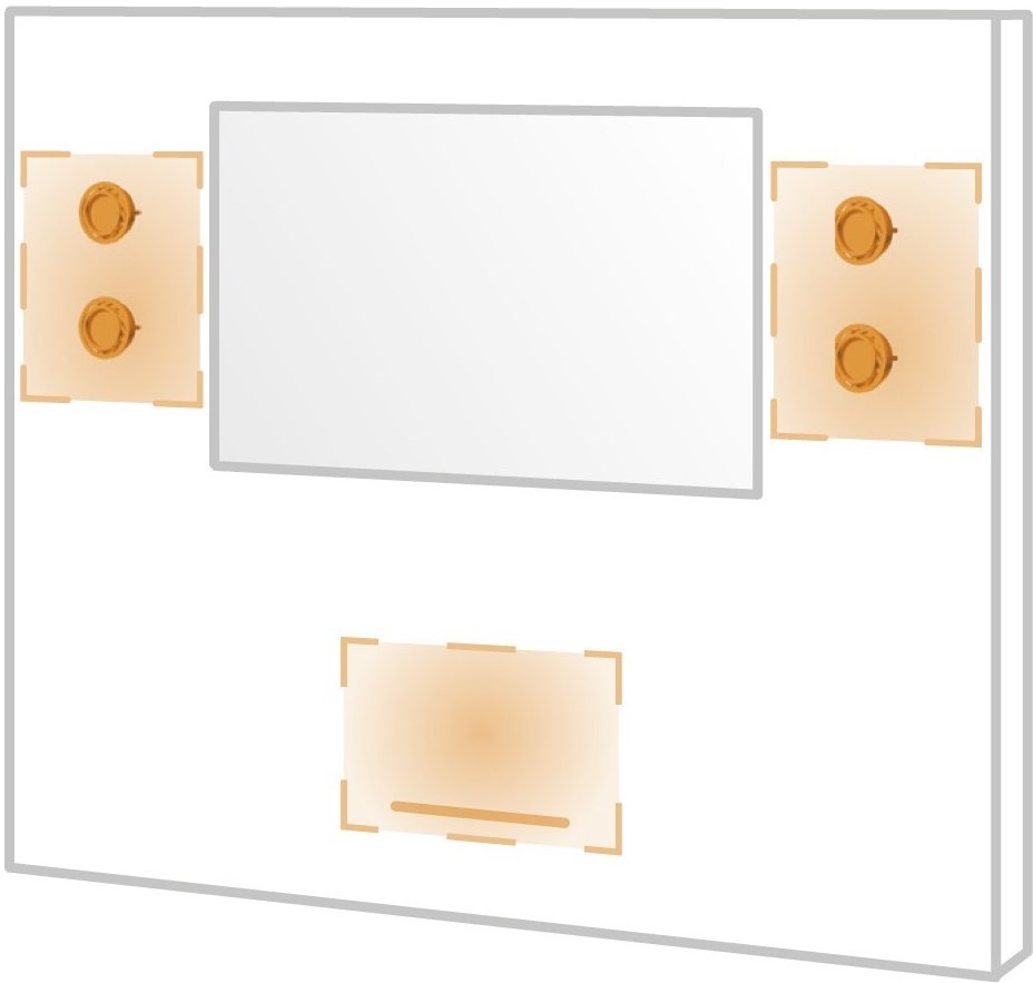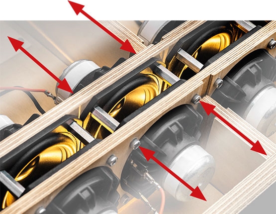 Durch die Anordnung und Verstrebung der Lautsprecherchassis nach dem ML BOXER Prinzip entstehen am Lautsprechergehäuse keine Vibrationen, die Klappergeräusche von z.B. Türen und Einlegeböden des Möbels verursachen könnten. Eine Entkopplung des Subwoofers vom Möbel ist deshalb nicht erforderlich.