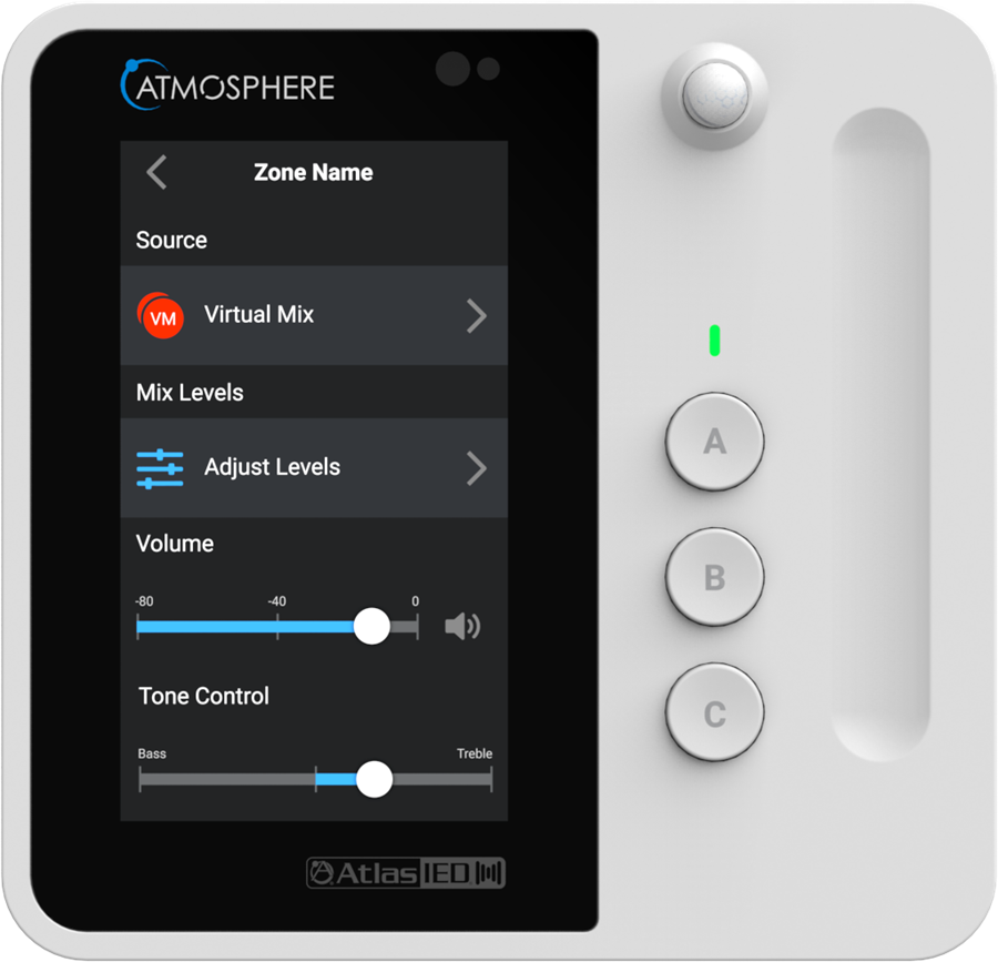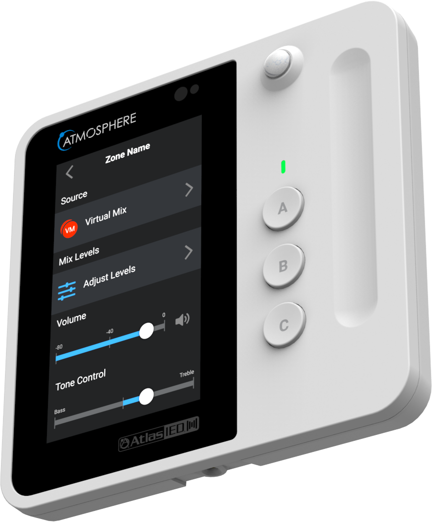 The AtlasIED Atmosphere C-T4 series wall controllers bring advanced functionality and intuitive design to the Atmosphere audio control system. Featuring a 4.3-inch programmable touchscreen, capacitive touch volume slider, and customizable action buttons, these controllers make managing zones, sources, and system actions effortless.