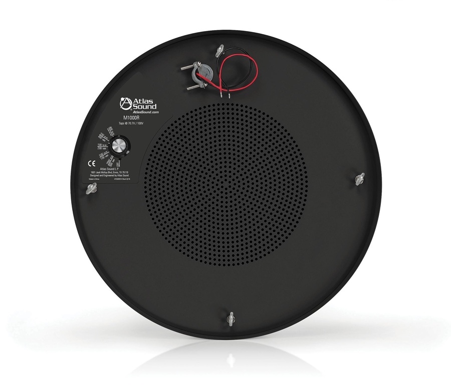 A high efficient 8" paper cone transducer coupled with a low insertion loss 70.7V transformer are factory assembled into the 382 in3 round enclosure. System level tuning is easily achieved via an external tap selector switch that includes settings for .25, .5, 1, 2 & 4 watts plus an OFF position. Installation is made easy via the included 78" (2m) suspension chain system that allows quick mounting and height adjustment of the M1000R-W. An integral wire strain relief strategically located on the top of the enclosure allows for secure speaker cable termination.